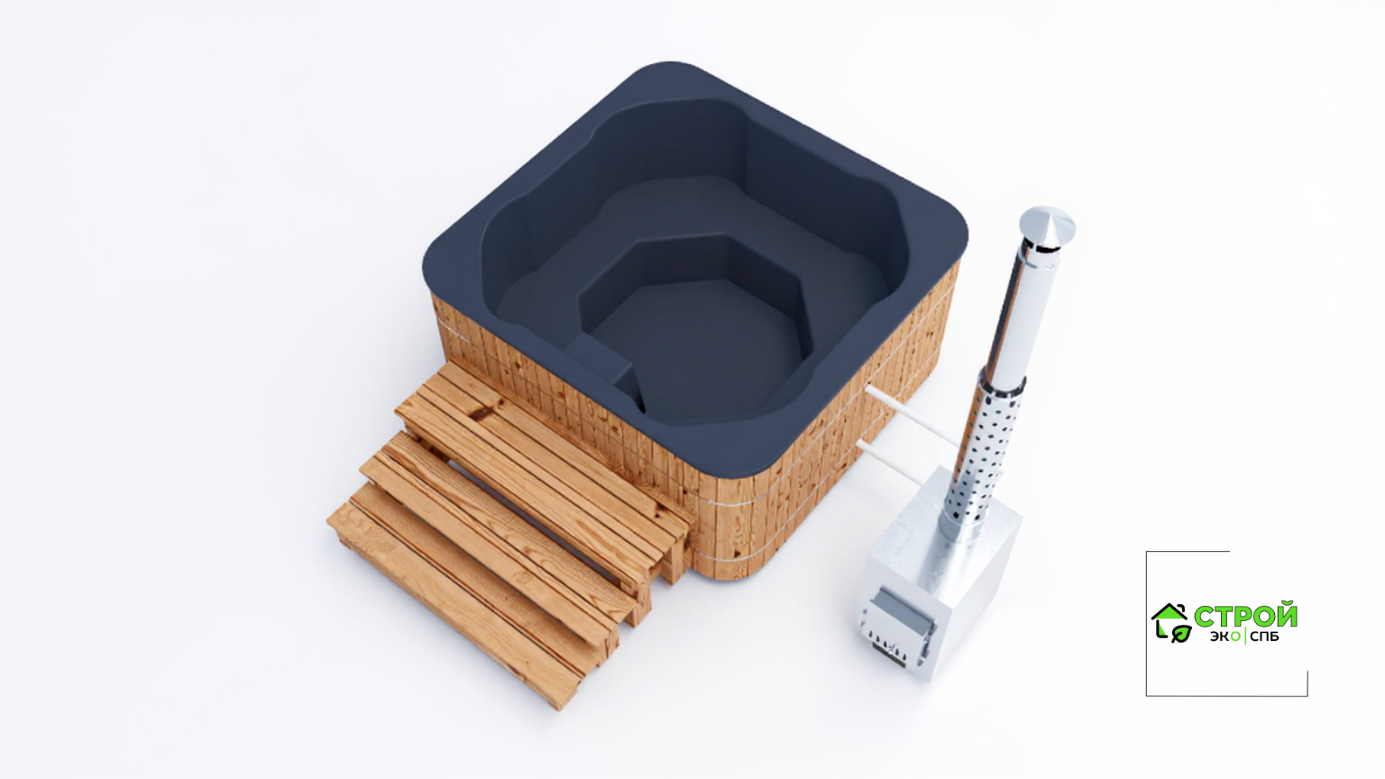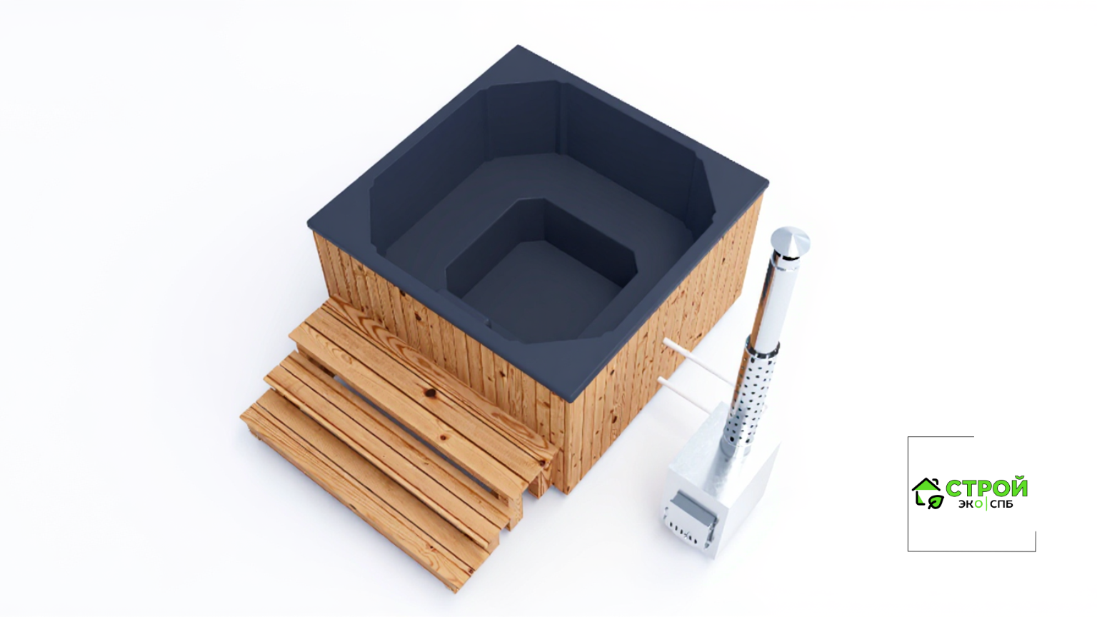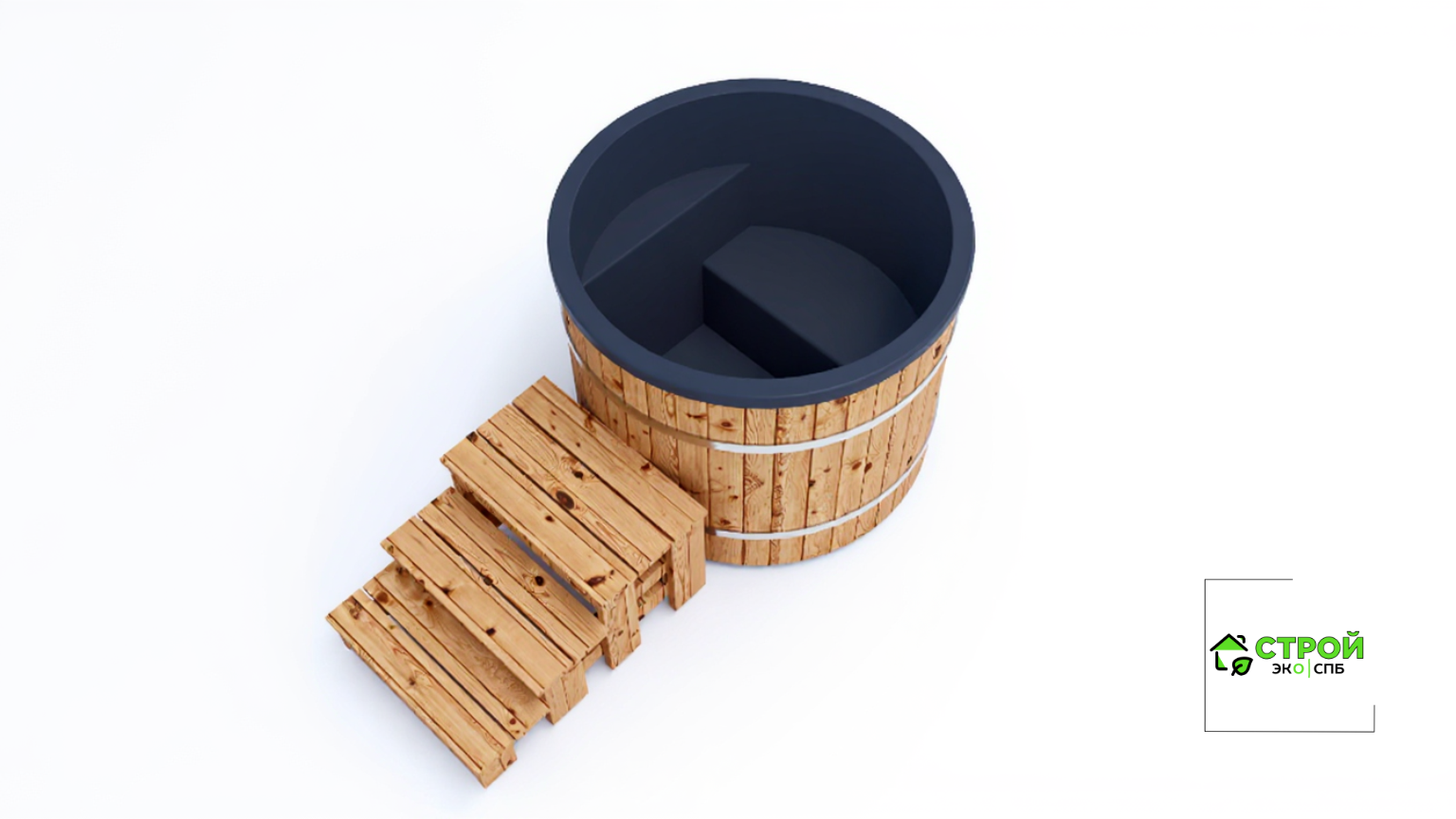 - Лестница - лестница из лиственницы с надежным покрытием террасным маслом. Удобно подниматься в купель, когда она располагается на отдельно стоящей площадке без погружения в террасу.